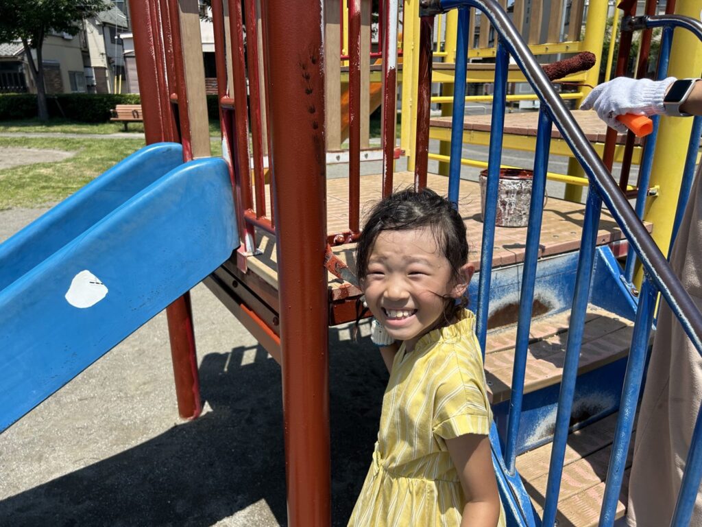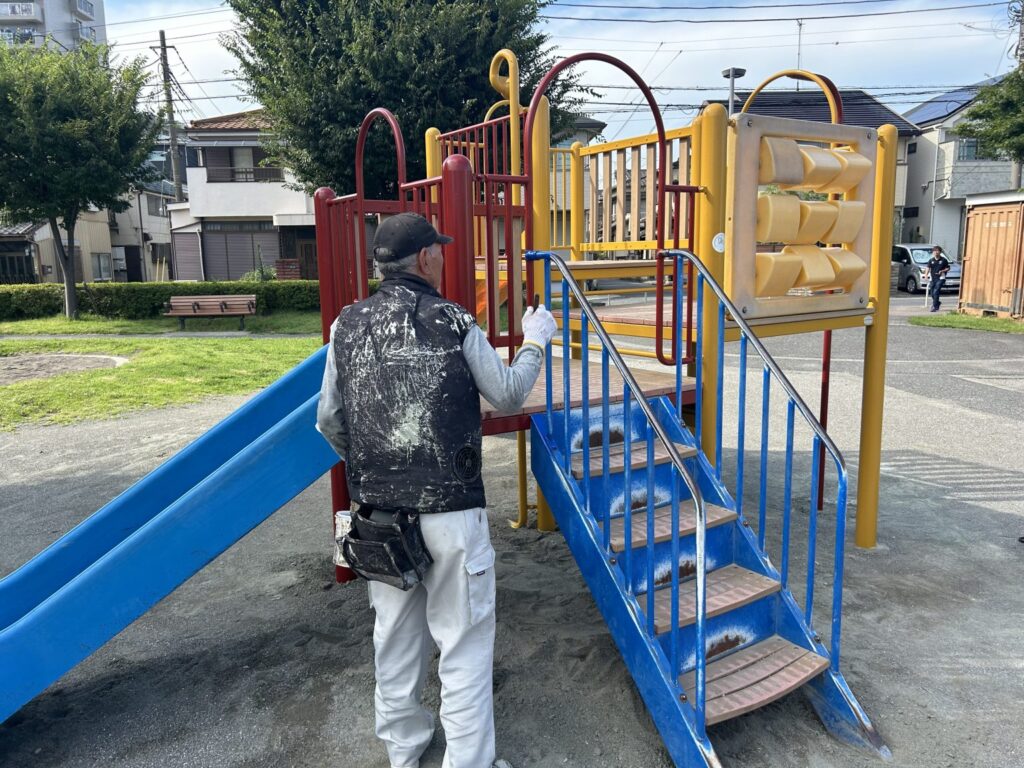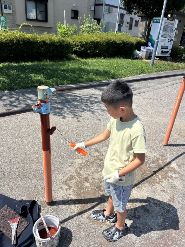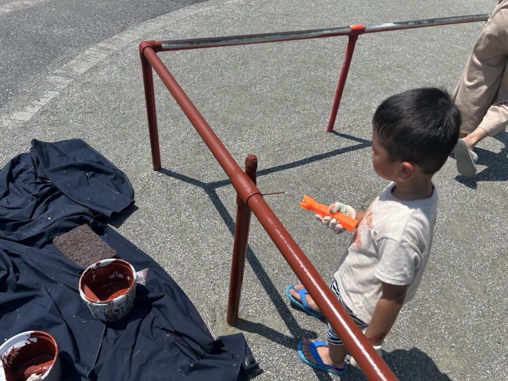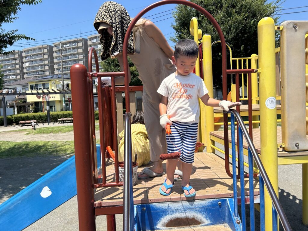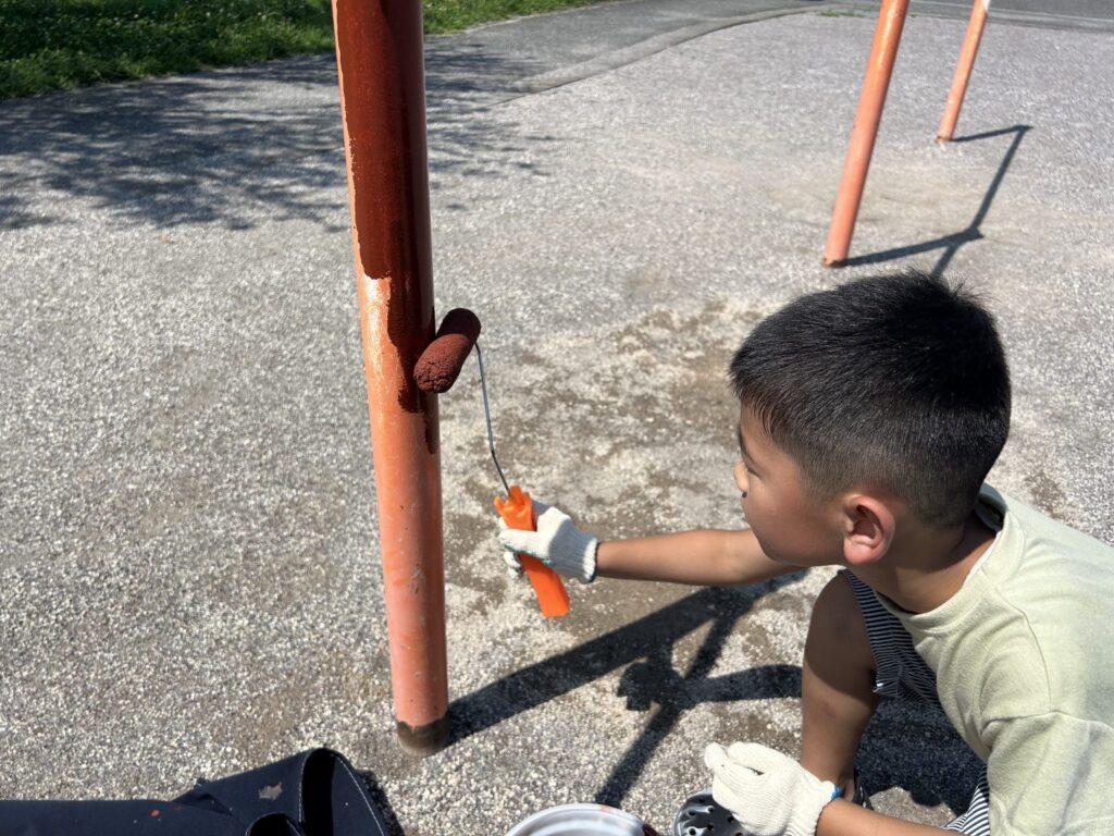 ボランティア塗装で公園の遊具の塗装を子供たちと行いました。とても暑い日でしたが人材不足の建設業で高齢化も進み少しでも若い子たちに興味を持ってもらえるよう楽しんで塗装してもらいケイペイントの成長に繋がればと思いみんなで