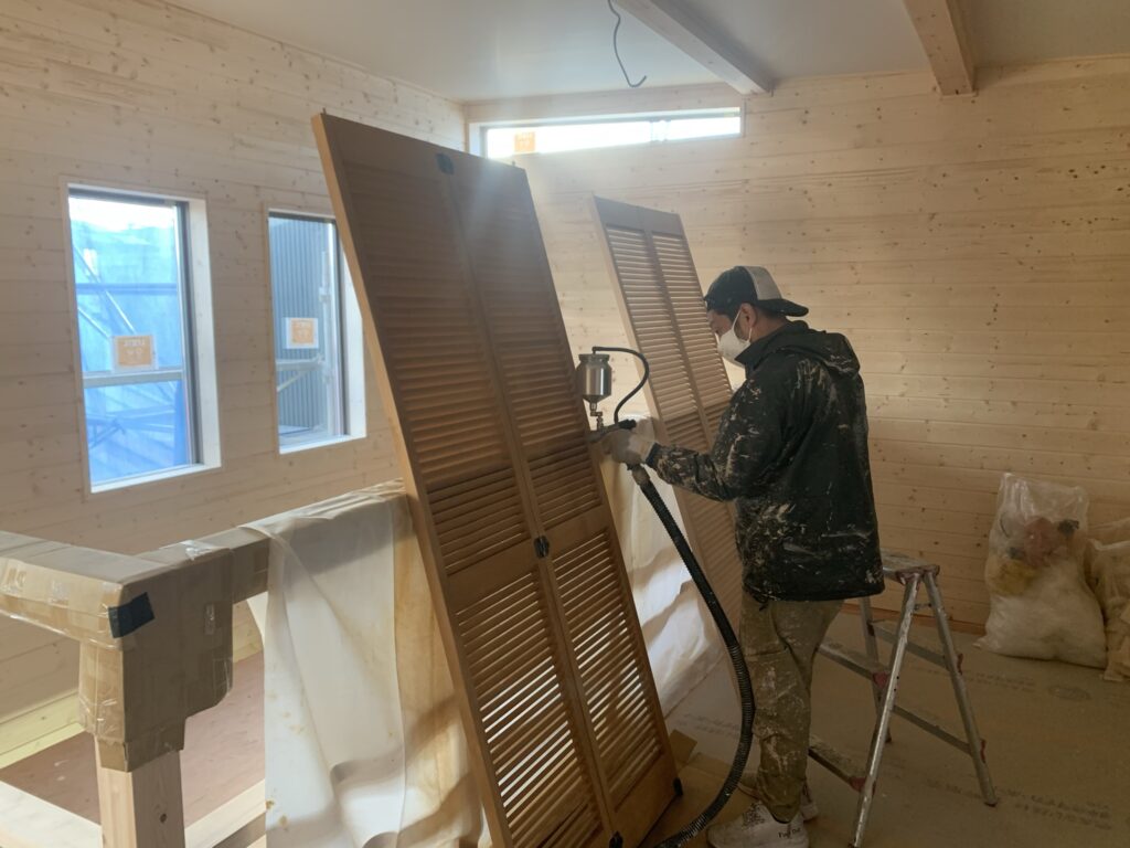 室内の壁は無垢の木で木目を生かす着色仕上げになります。最初は凄く塗装する場所があり綺麗に仕上がるのか不安でしたが熟練の職人さんによる仕上げでとても綺麗になりました!着色する事によって木もまた一味違った表情を見せてくれます^_^8割型終ってきたので残りも頑張ります!