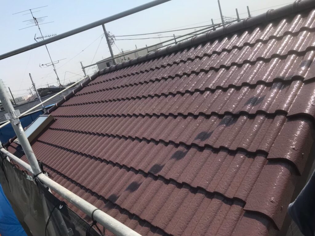 今回は屋根の塗装編です。屋根は紫外線、雨風を一番受けやすく一番傷みやすい場所です。なかなか見ることが出来ないのですがコケが大量に生えていたり、割れていたりとゆう症状が出ています。塗装前にしっかり高圧洗浄器であらい汚れを落としてからその屋根の下地、材質などに合わせて補修、下塗り、中塗り、上塗りで3工程で塗装していきます。